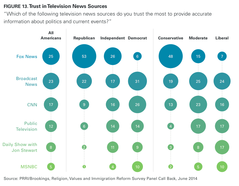 A Public Religion Research Institute/Brookings Institute study of Americans’ views on immigration reform finds that people’s media choices have a strong effect on their beliefs: