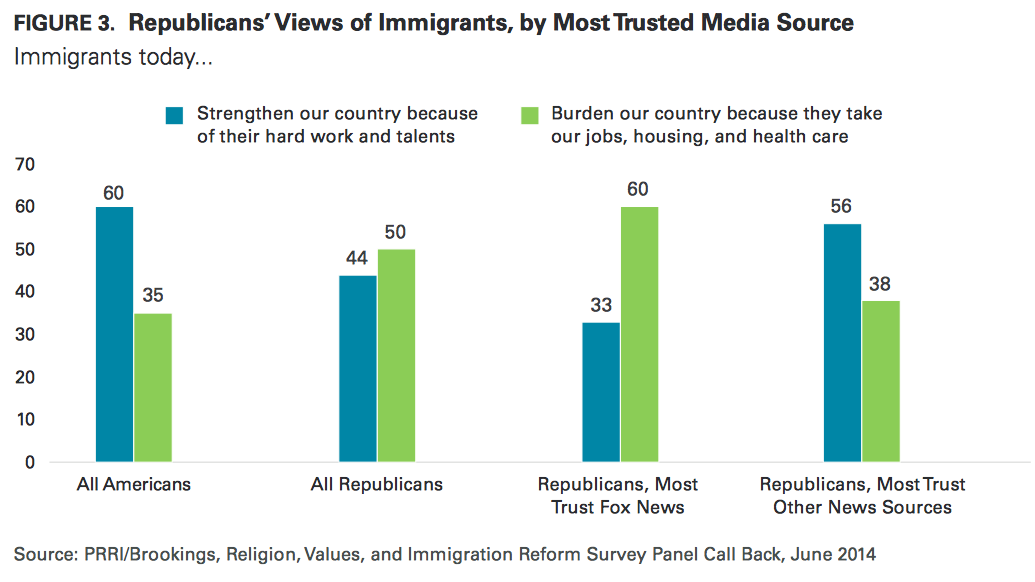 A Public Religion Research Institute/Brookings Institute study of Americans’ views on immigration reform finds that people’s media choices have a strong effect on their beliefs: